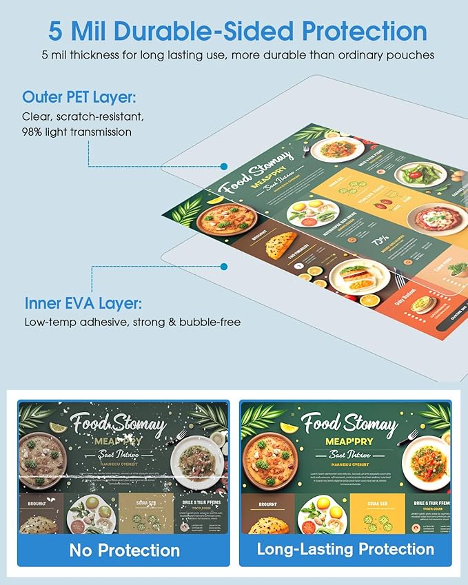 - Letter Size Compatibility: Each 9" x 11.5" laminating sheet fits letter-size documents (8.5" x 11") with a secure 0.25" sealed border. The extra edge ensures full coverage and tight sealing in most thermal laminators. The thicker 5 mil construction delivers superior rigidity and long-lasting protection, perfect for heavy-use items like classroom charts, frequently handled documents, menus, and reference guides — while still allowing smooth feed-through in standard thermal machines. Please note: these are not self-adhesive sheets and require a heat laminator.