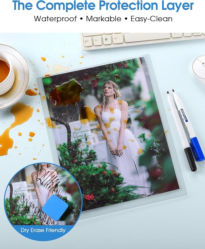 - Crystal Clear Finish & Safe Corners: With 97% light transmission, these glossy laminate sheets offer crystal-clear visibility and distortion-free reading. The smooth surface works perfectly with dry-erase markers, allowing you to write and wipe off easily without residue. Rounded corners ensure safe handling in classrooms, offices, or workshops — no sharp edges or paper cuts.