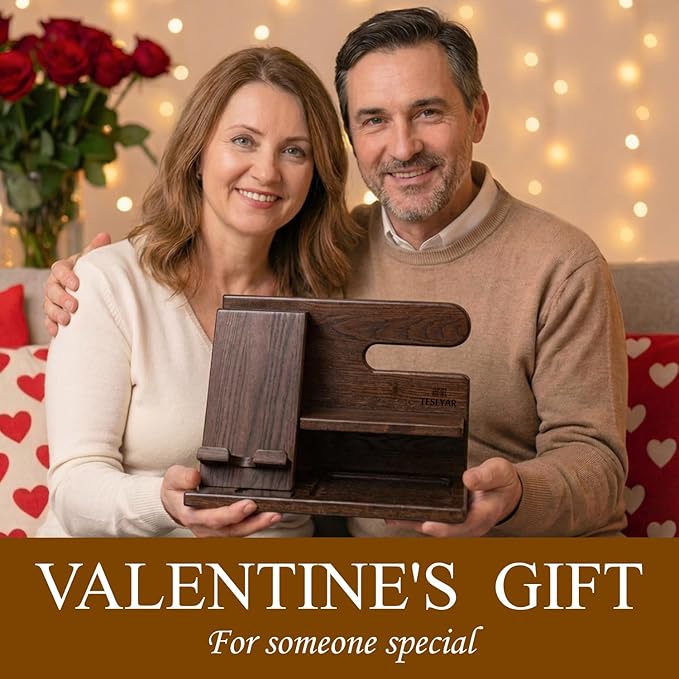 TESLYAR Wood Phone Docking Station for Men - Desktop or Nightstand Organizer - Birthday Gifts for Men, Dad - Anniversary Idea from Wife - Key Holder, Stand Wallet, Watch & Essentials (Bourbon Brown)