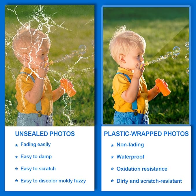 - ONE-SIDED SEALING: Plastic film is sealed on one side, so that the two layers of film will not easy to fall off, just open the other unsealed side into the document, and then into the laminator, convenient to print out ultra-clear documents