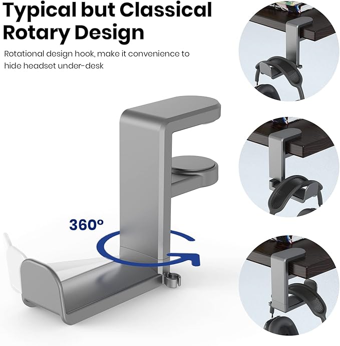 - 【Rotating Adjustable Headphone Arm】Experience effortless access to your headphones with 360-degree swivel design. The gaming headset stand makes it easy to get your desired directions, even tucking them neatly under your desk when not in use.