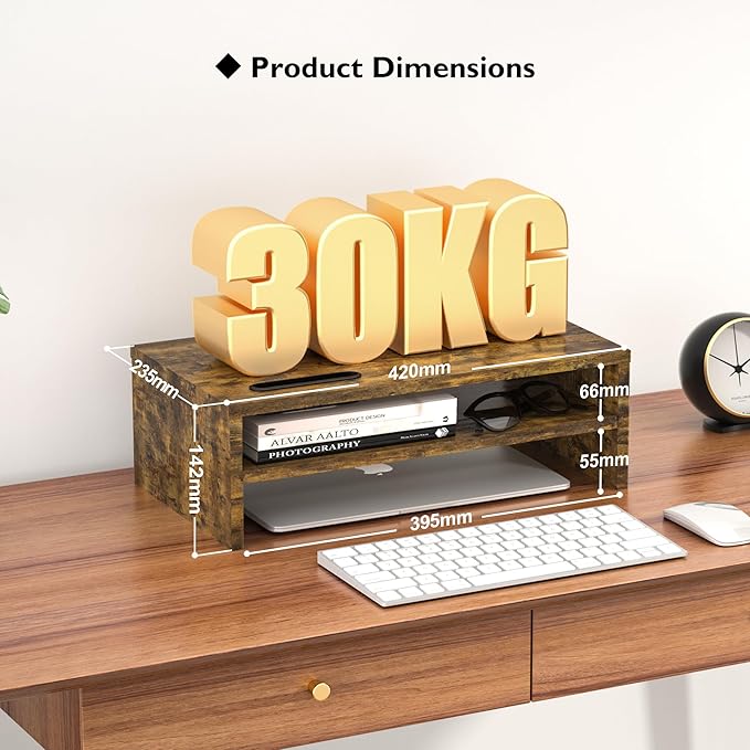 - MONITOR STAND WITH STORAGE ORGANIZATION FEATURES - This two-tier monitor stand provides ample storage for your laptop, keyboard, mouse, and other accessories. The built-in cellphone holder and cable management slots help keep your desk tidy and organized