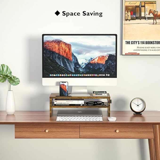 BONTEC Wooden Monitor Stand Riser, 2-Tier Desk Shelf with Storage Organizer, Ergonomic Computer Stand with Cable Management, Cellphone Holder, Vintage Brown, 16.5 Inch