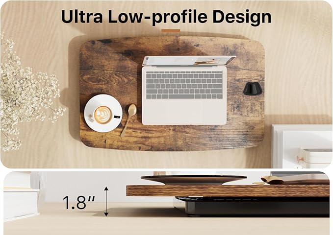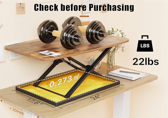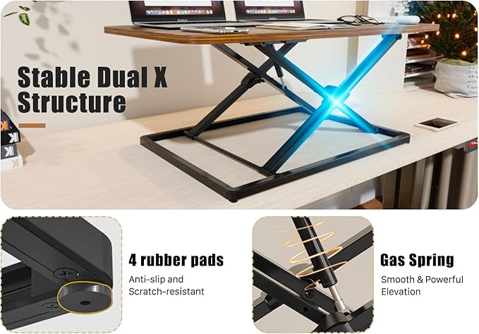 - Sturdy Structure & Low Profile Design: Double X-shaped heavy-duty frame holds up to 22lbs, and the slim standing desk riser distributes the weight evenly at any height within range. When lowered to the lowest, the desk is only 1.8" thick