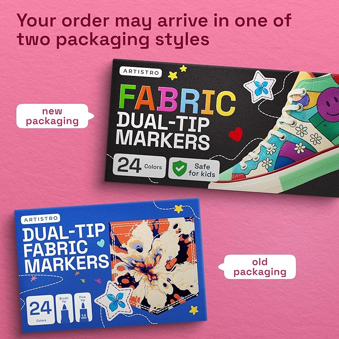 ARTISTRO 24 Dual-Tip Fabric Markers - Fabric Decorating Kit - Permanent for Clothes - Acrylic Paint Pens for Sneakers, Bags, Shoes, Textile, Canvas, Sewing, Craft, DIY - Brush and Fine Tip