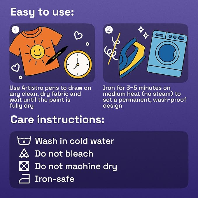 - Easy-to-Use: These fabric pens for clothes permanent are easy to use and are even perfect as fabric markers for kids! Simply apply your design to clean, dry fabric. After the clothes paint is fully dry, set the design by ironing it on medium heat (without steam) for 3-5 minutes to ensure long-lasting results.