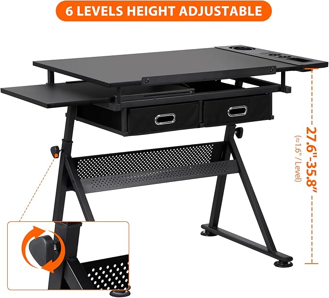 - This adjustable tabletop and height drawing desk is made of high quality MDF board with PVC, durable powder coated steel frame and non-woven drawers. The sheet stopper on lip effective prevent sheets slipping
