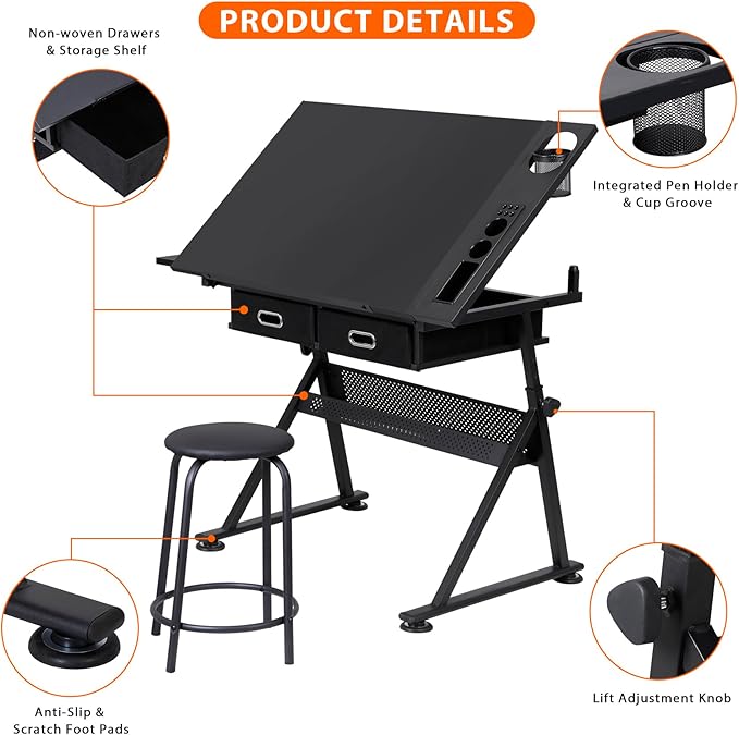 Drafting Table Drawing Desk Art&Craft Work Station Height Adjustable Tilting Tabletop Craft Table Desk w/Stool and 2 Storage Drawers for Home Office Study Room, Black