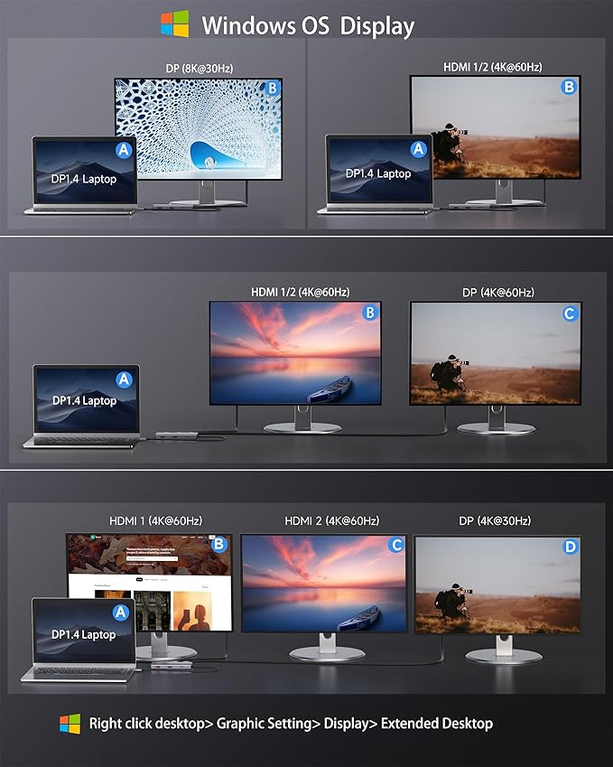 - [4K Triple Monitor Docking Station]: This computer docking station, a USB-C hub with dual HDMI ports and 1 DisplayPort interface, is an HDMI USB-C adapter triple-monitor docking station (supporting up to three 4K video outputs at maximum. When using HDMI alone, it supports up to 4K@60HZ at maximum, and the DP interface supports up to 8K@30HZ and 4K@144HZ/4K@120HZ. When expanding two monitors, the resolution can reach dual 4K@60Hz)--DP1.4 laptop. Mac OS only supports mirror mode
