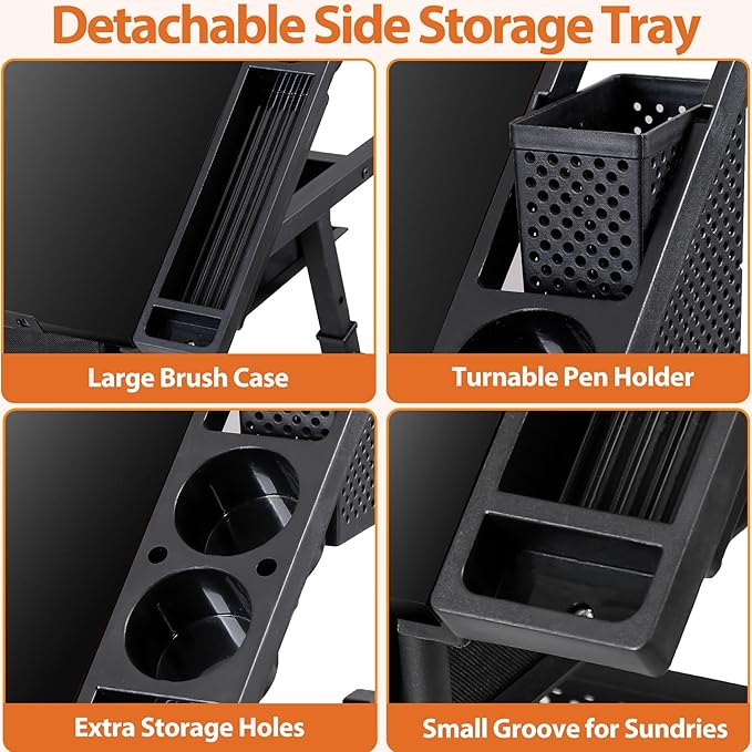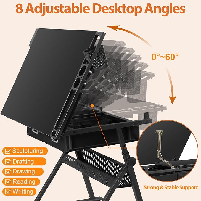 - This adjustable tabletop and height drawing desk is made of high quality MDF board with PVC, durable powder coated steel frame and non-woven drawers. The sheet stopper on lip effective prevent sheets slipping