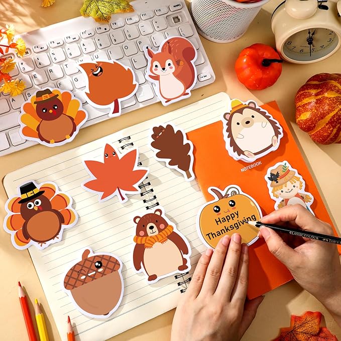 Zhanmai 1200 Pcs Thanksgiving Fall Sticky Notes Bulks Thanksgiving Memo Notepads Turkey Pumpkin Squirrel Maple Leaf Sticky Notes Fall Self-Stick Pads Autumn Gifts