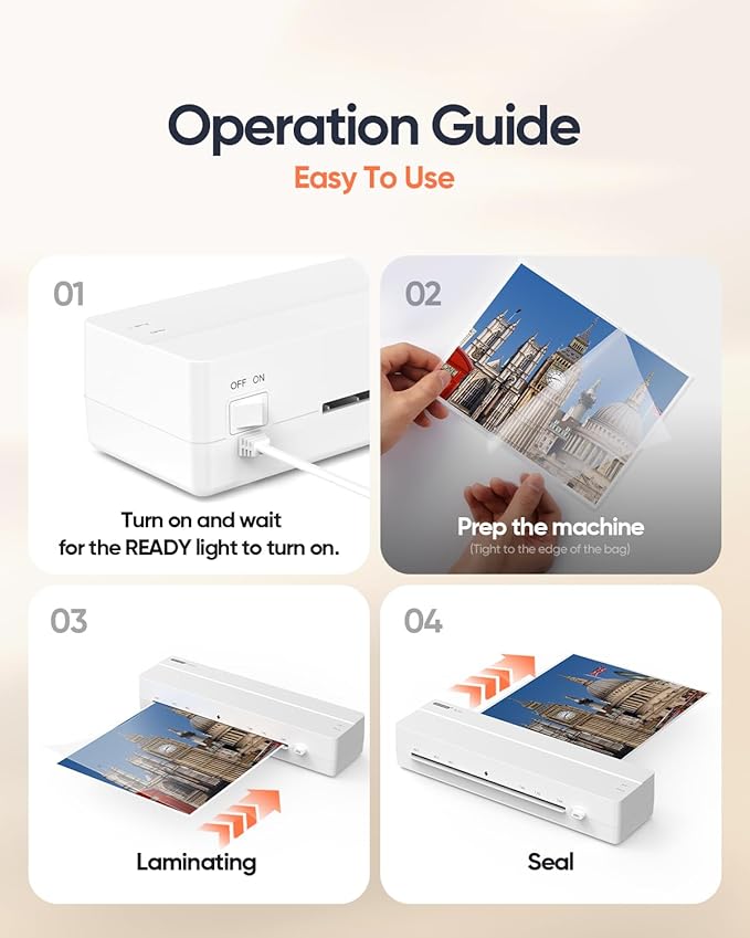 - 【Tips & Usage Recommendations】 For standard paper, use 3 mil pouches; for thicker items like photos or cards, use 5 mil. Insert the sealed end of the pouch into the laminator first to avoid jams. It's normal to notice a slight odor during first use—this will fade and is non-toxic. Let the machine cool after 20 minutes of continuous use to prolong its life.
