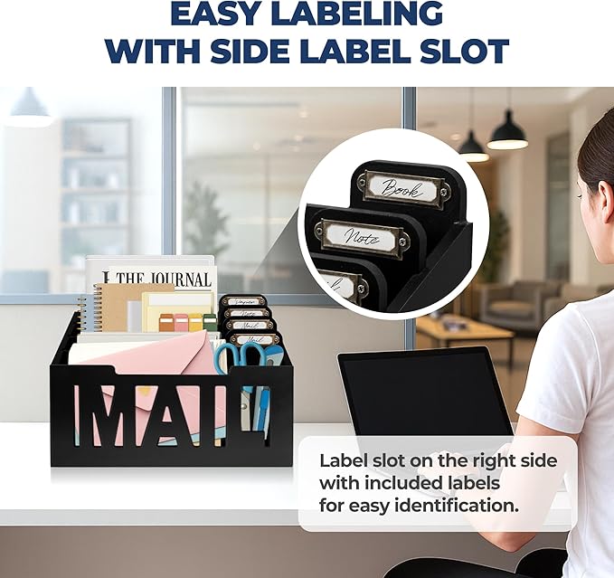 - 4 COMPARTMENTS WITH LABEL TAGS : This mail organizer for desk includes 4 slots plus customizable name tags for easy sorting. Use labels for departments, family members, or document types to simplify organization.