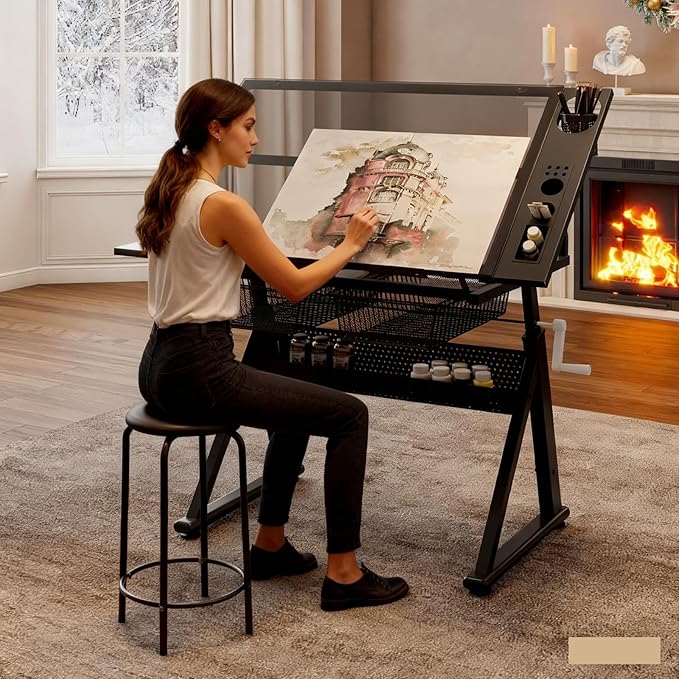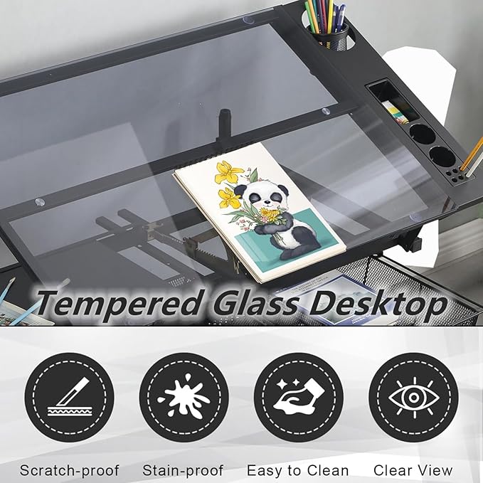- 【Sturdy and Stylish Construction】Crafted with a high-quality full-transparent glass surface and supported by a sturdy powder-coated steel frame, this drafting table not only looks elegant but is built to last. The nonwoven drawers provide convenient storage for your art supplies, making it ideal for artists, designers, and hobbyists alike. Plus, the accompanying stool features strong steel legs, ensuring you have a stable seat while you work on your masterpieces.