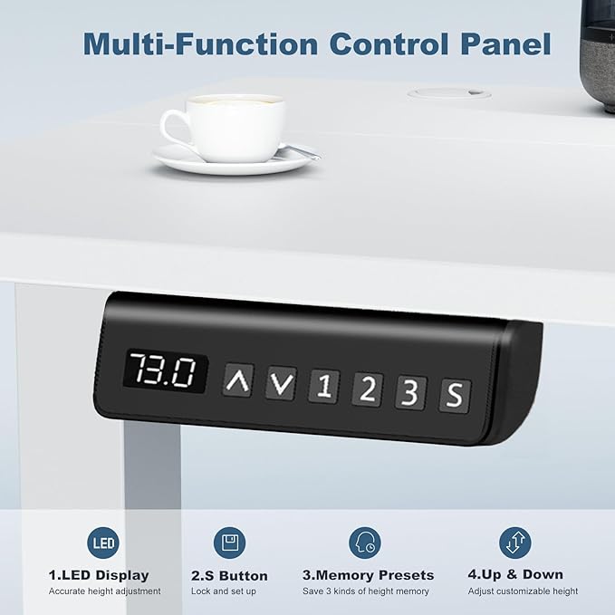 - Programmable Memory Presets: Store 3 custom height settings with the intuitive LED control panel. One-touch recall makes it easy to maintain ergonomic consistency, encouraging movement and reducing fatigue. A smart, user-friendly feature that supports healthy habits and daily productivity with your standing desk.